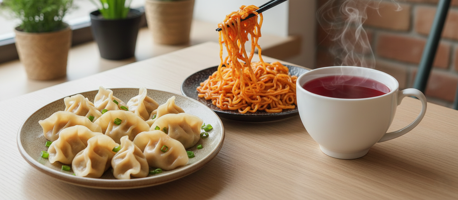 В состав входят пельмени танжиау, две пампушки, компот и салат.