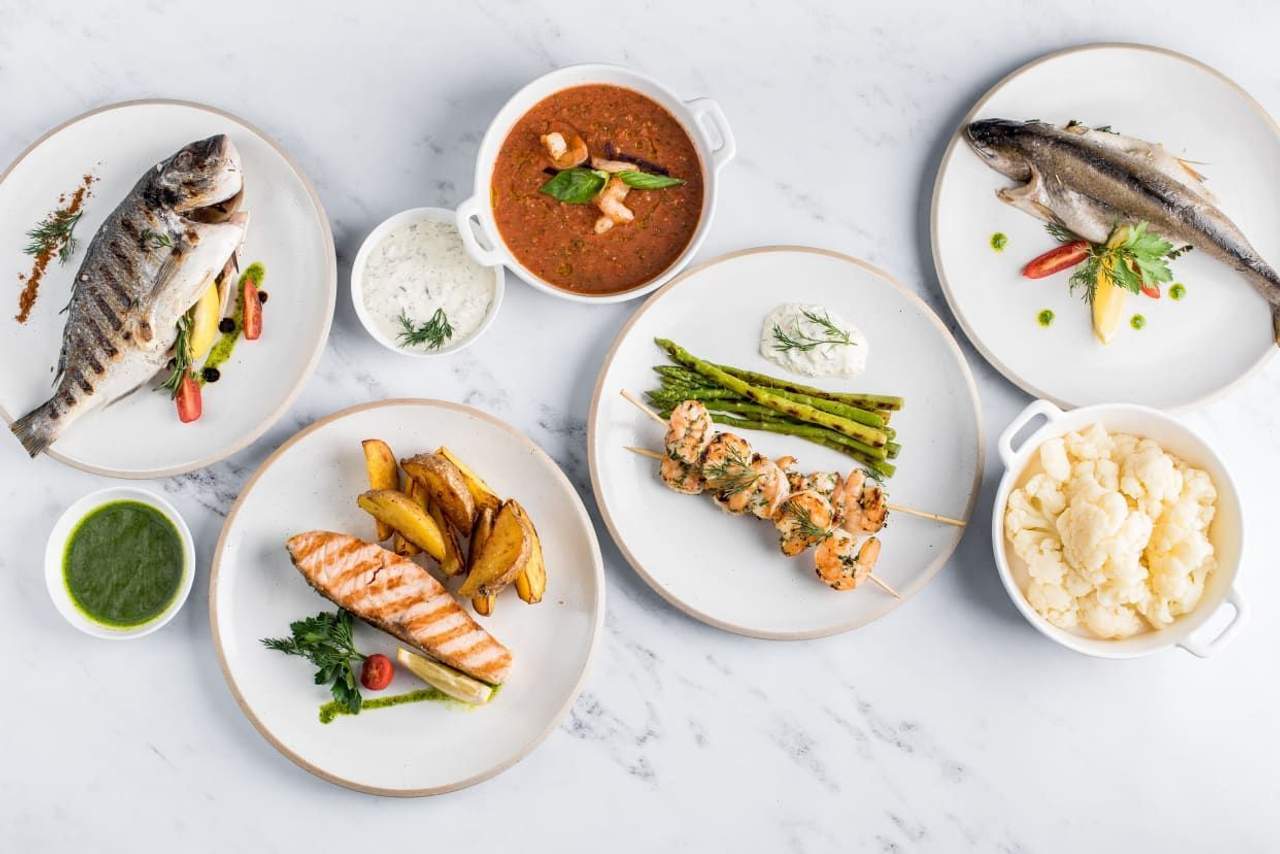Лосось, судак, брокколи, грибы, картофель, зелень.