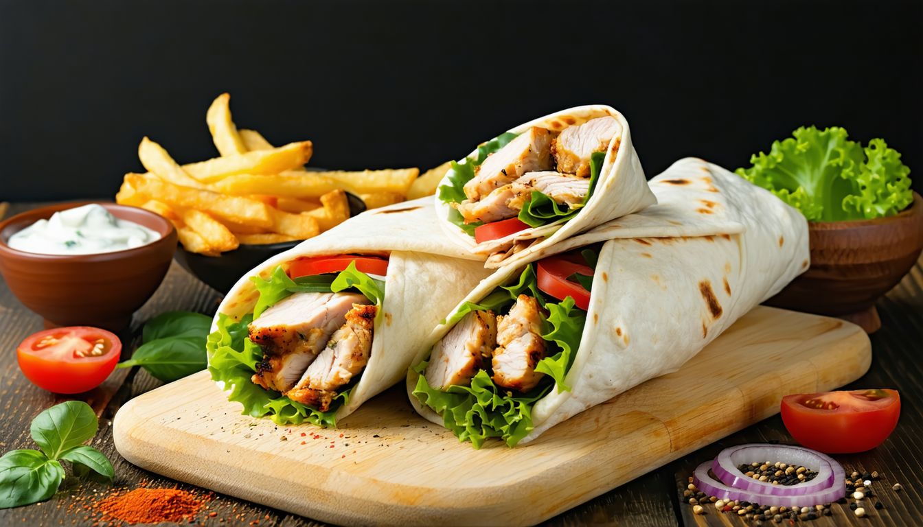 Лаваш, курица, огурцы, помидоры, лимон, листья салата, картошка фри, специи, лук, сыр
