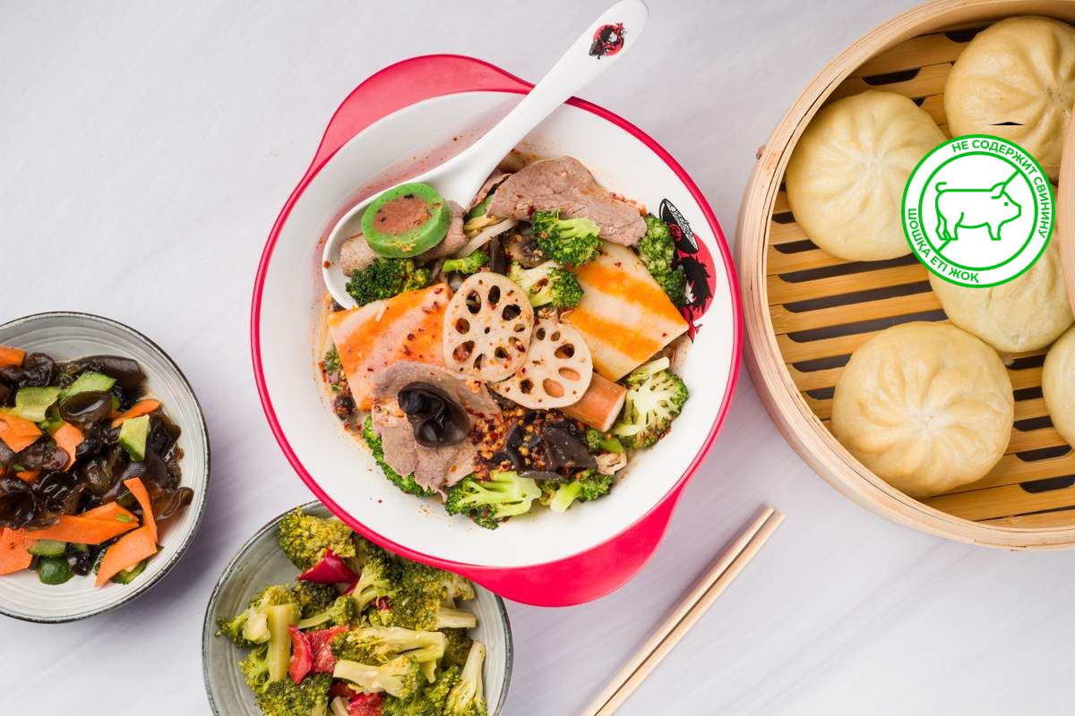 Кукурузная лапша, бок-чой, корень лотоса, эноки, брокколи, древесные грибы и морепродукты, острый