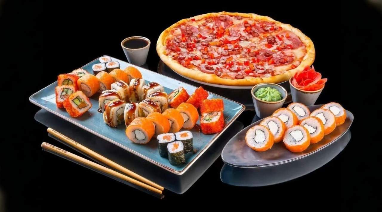- Филадельфия (10 шт.) - Каппа маки (10 шт.) - Калифорния темпура (10 шт.) - Темпура (10 шт.) - Каппа запеченная (10 шт.) - Пицца с курицей и грибами (1 шт.) - Пицца "Маргарита" - Картофель фри - Coca-Cola (1 л.) в подарок