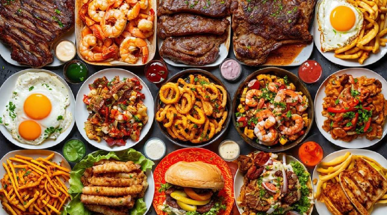 Стейк Рибай 200 гр, колбаски говяжие, мини чебуречки, овощное соте, картофель с чесноком , свежий салат, сладкий десерт, хлеб факачо