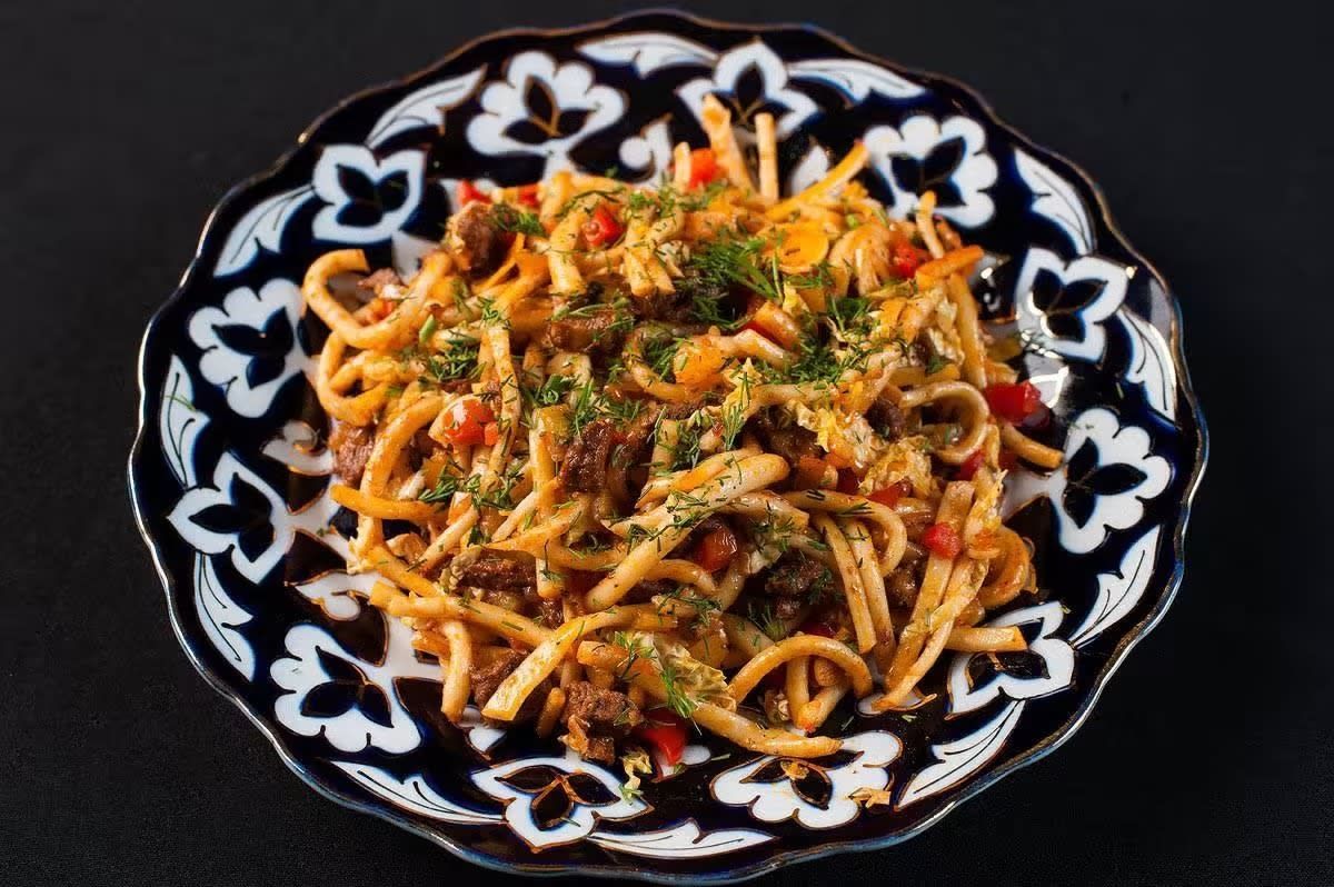 Жареный лагман мелкой нарезки овощей и мяса. В порции 350 г