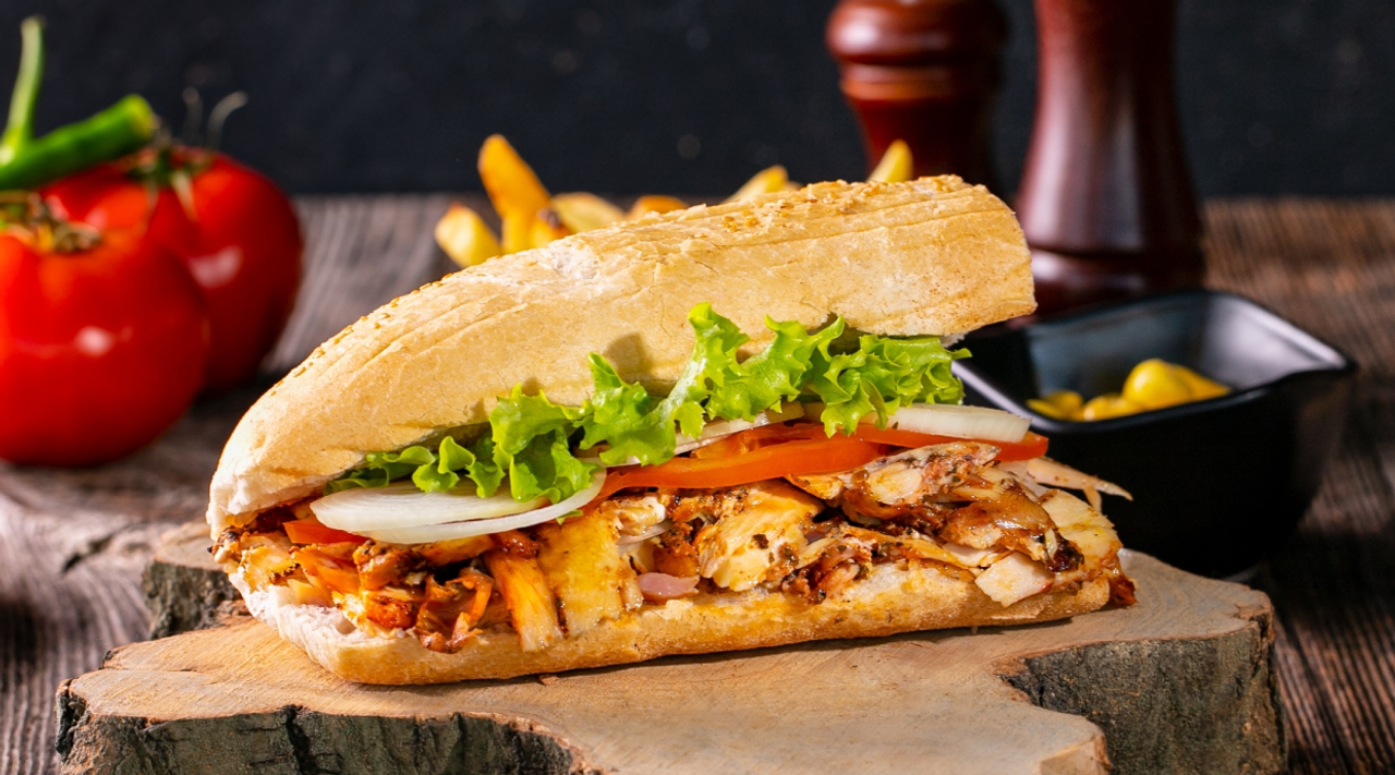 Картофель фри, чесночный соус, кетчуп, помидор, огурцы, лаваш, курица, говядина