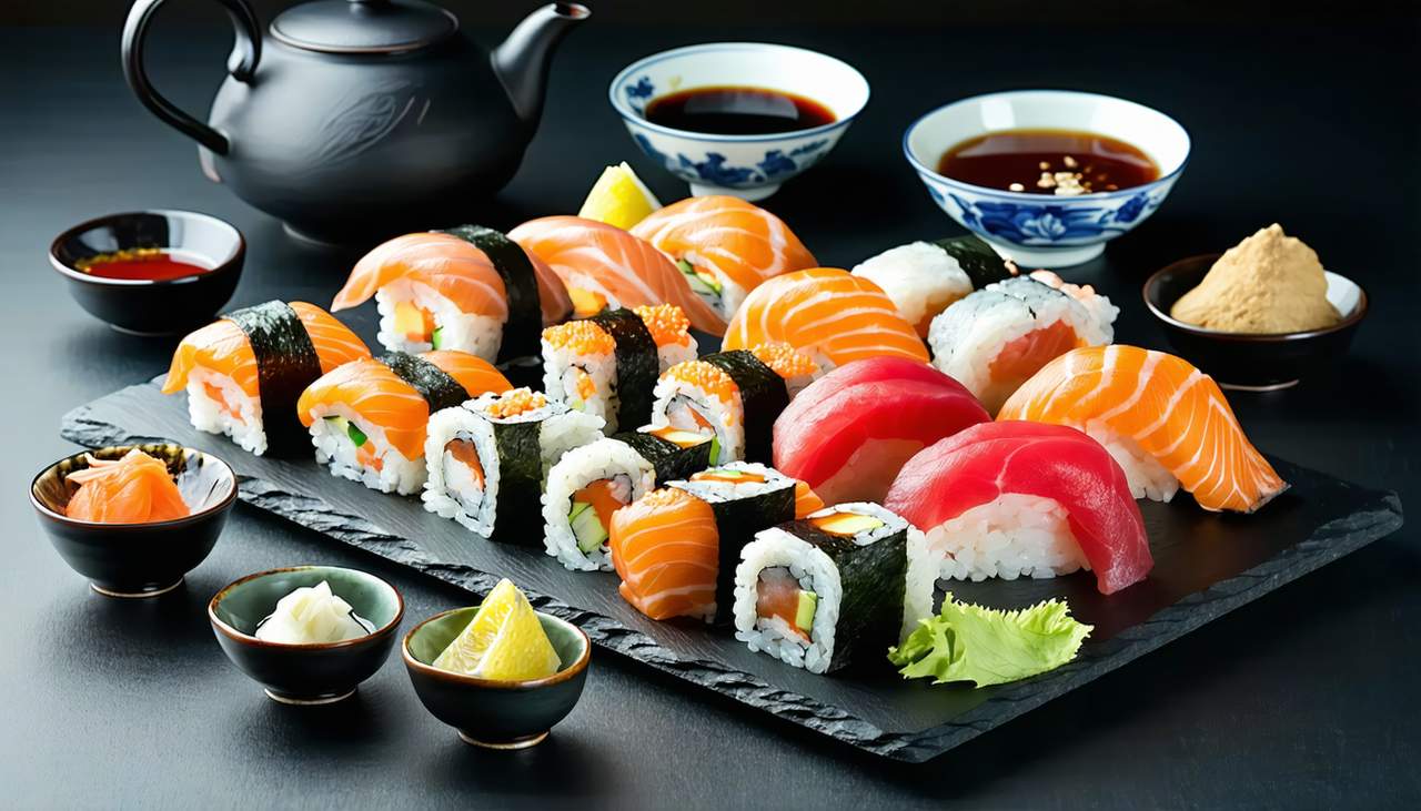 рис для суши, водоросли нори, лосось, угорь, огурцы, сливочный сыр, темпурная панировка