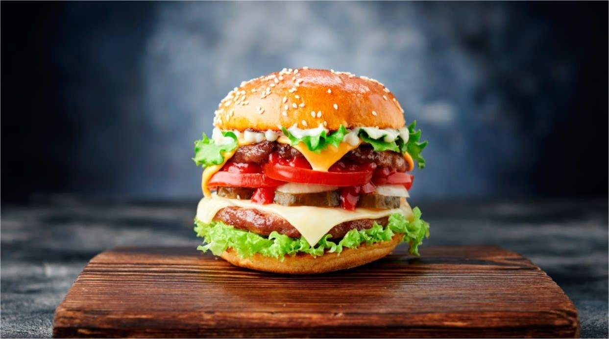 Фирменный бургер с двойной котлетой и сыром Чеддер томатами, красным луком, солеными огурцами, микс салатом и тремя соусами: BBQ, "Айоли" и "Сливочный Карри"