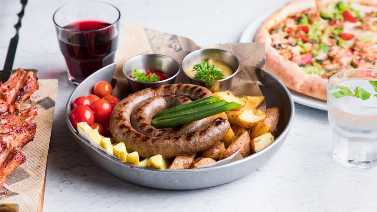 Кетчуп горчица, колбаски из баранины, картофель отварной мелкий, масло чесночное, лук зеленый, приправа для картофеля профипак, огурцы и помидоры черри маринованные
