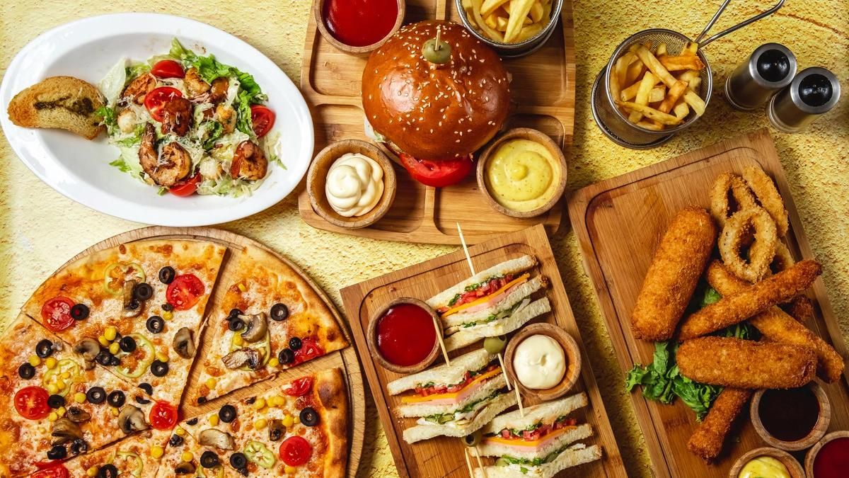 Булочка,красный соус,тартар соус,сыр,листья салата,помидор,котлеты куриное и говядины