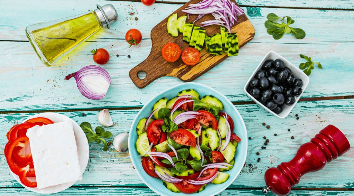 Микс листьев салата,томаты, сладкий перец, маслины, оливковое масло