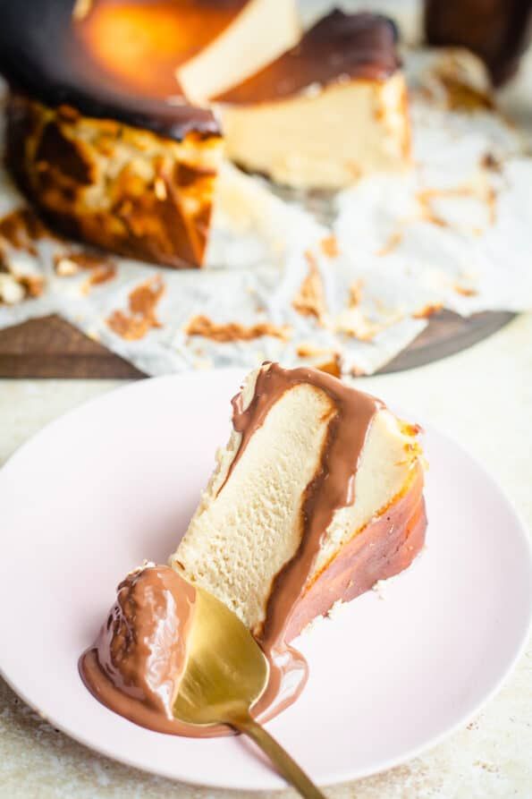 Gâteau composé d'éponge au chocolat, knafeh, Nutella et sauce pistache