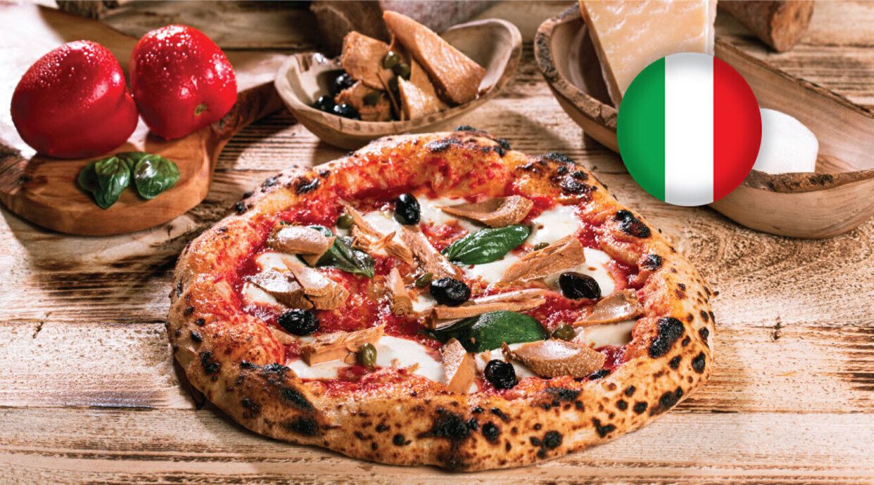 Pizza au feu de bois, sauce tomate, anchois, câpres, oignon rouge, olives noires , basilic, tomates cerises.
