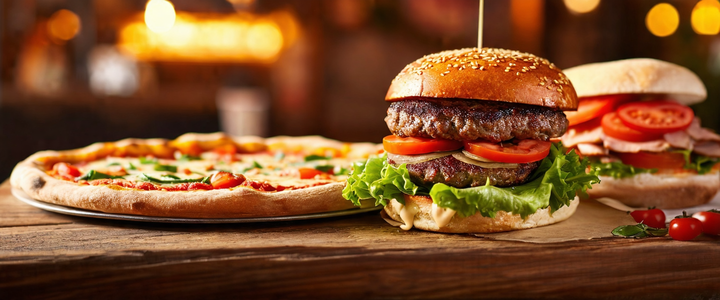 Steak haché, fromage, laitue, tomate, oignon, cornichons