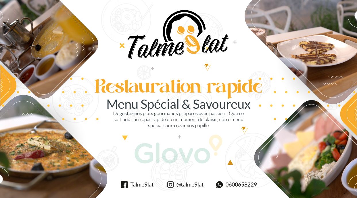 To order your Talme9lat delivery in Agadir, all you have to do is open the Glovo website or app and go to “RESTAURANT” category. Next, enter your address to see if delivery for Talme9lat is available in your area of Agadir. Then you can choose the products you want and add them to your order. Once you complete the payment, your order will start to be prepared and soon after a courier will bring it directly to your door.