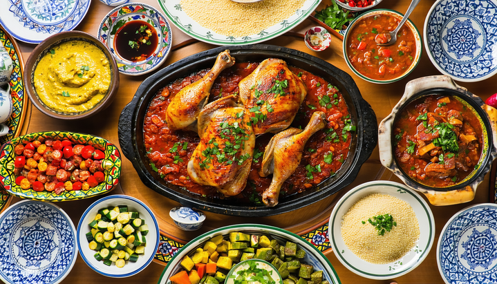Poulet mijoté dans une sauce onctueuse aux oignons caramélisés, huile d'olive, épices marocaines et olives