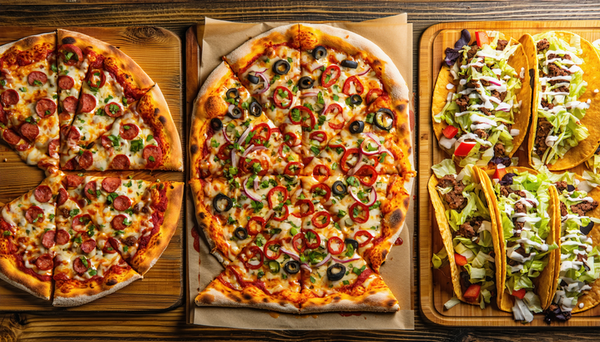 Sauce tomate, mozzarella, thon, poulet, viande hachée, jambon fumée