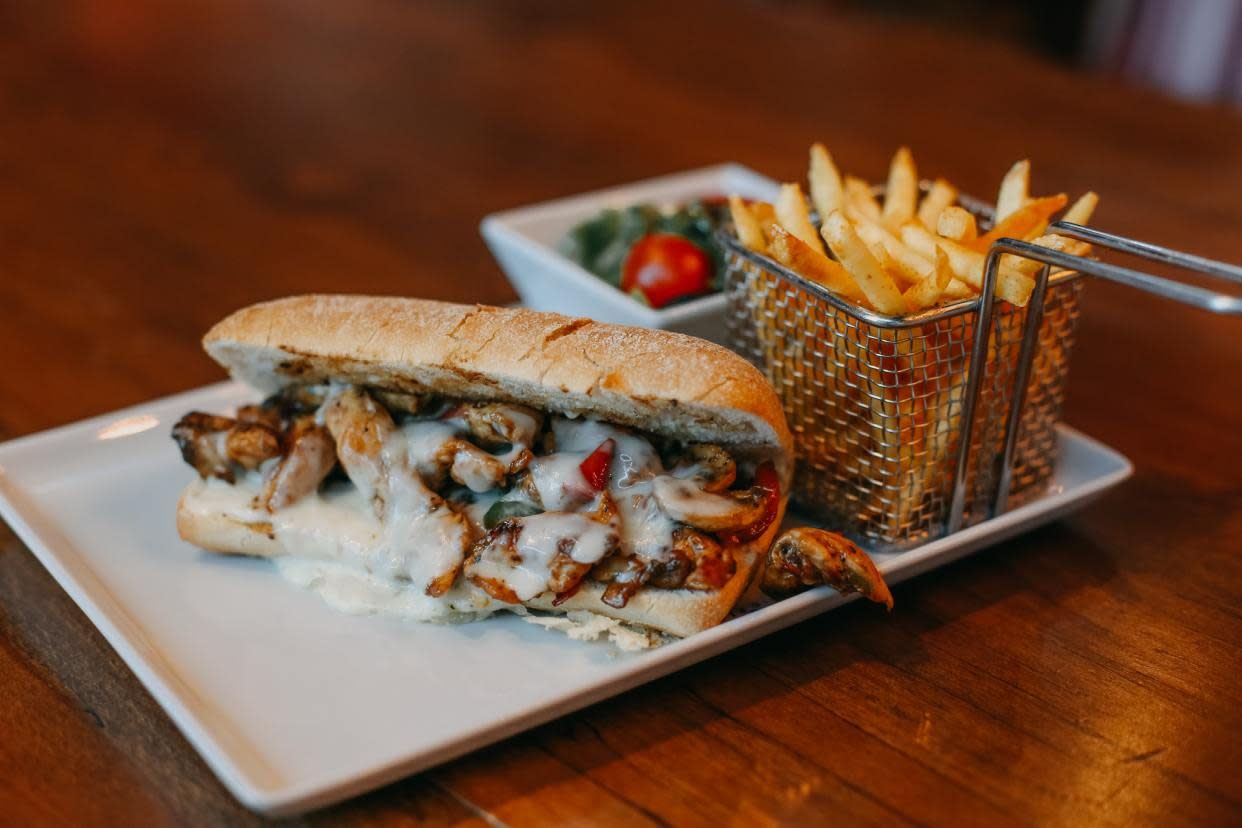 Salade, tomate, sauce fromagère, poulet mariné, fromage cheddar, sauce au choix, servi avec frites.