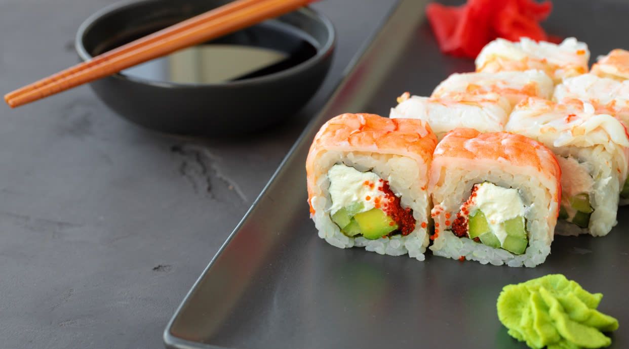 Crevettes panée, avocat anguille, surimi, tobiko, philadelphia