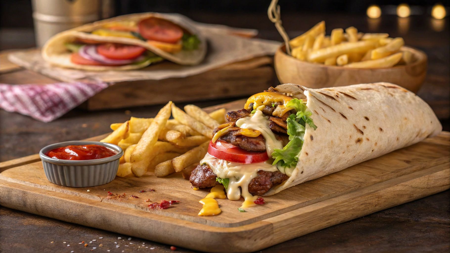 pain en pâte à pizza ,Bœuf haché assaisonné, fromage, tomate, oignon, laitue, sauce maison
