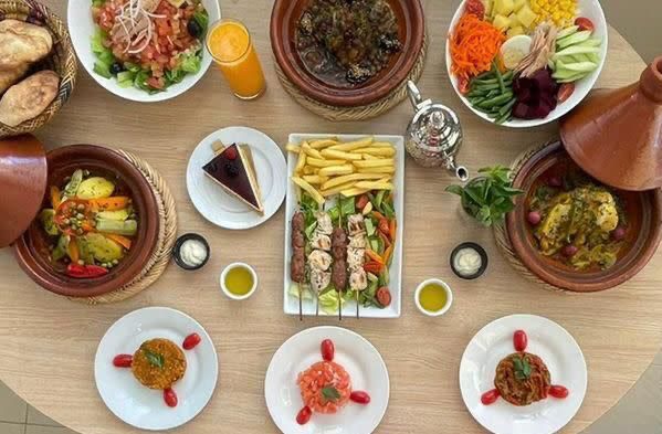 Dattes, chebakia, sellou, harira, œuf dur, msemen, harcha, beurre, miel, lait, jus d’orange, boisson chaude, sidi ali 33 cl + choix entre tagine du jour ou grillades