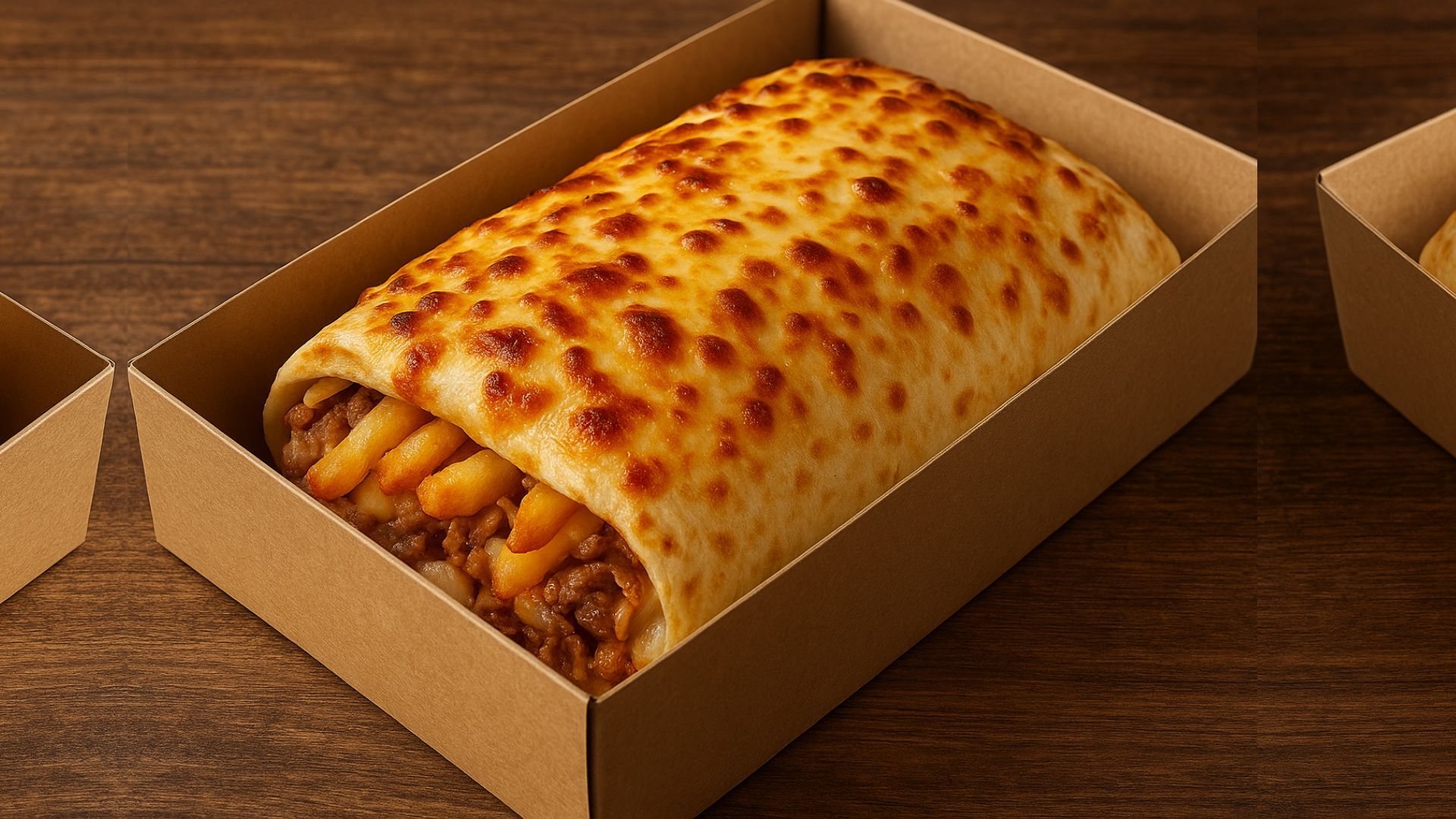 Tacos gratiné ,poulet mariné , viande hachée, , cordon bleu, dinde fumée,frites a l’intérieur