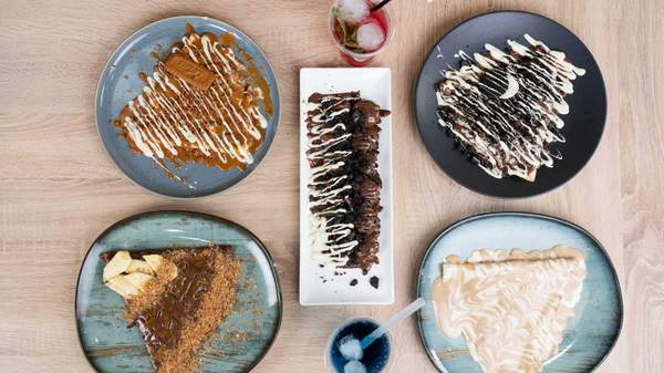 Crêpe, gaufre, glaces, brownies, nutella, caramel