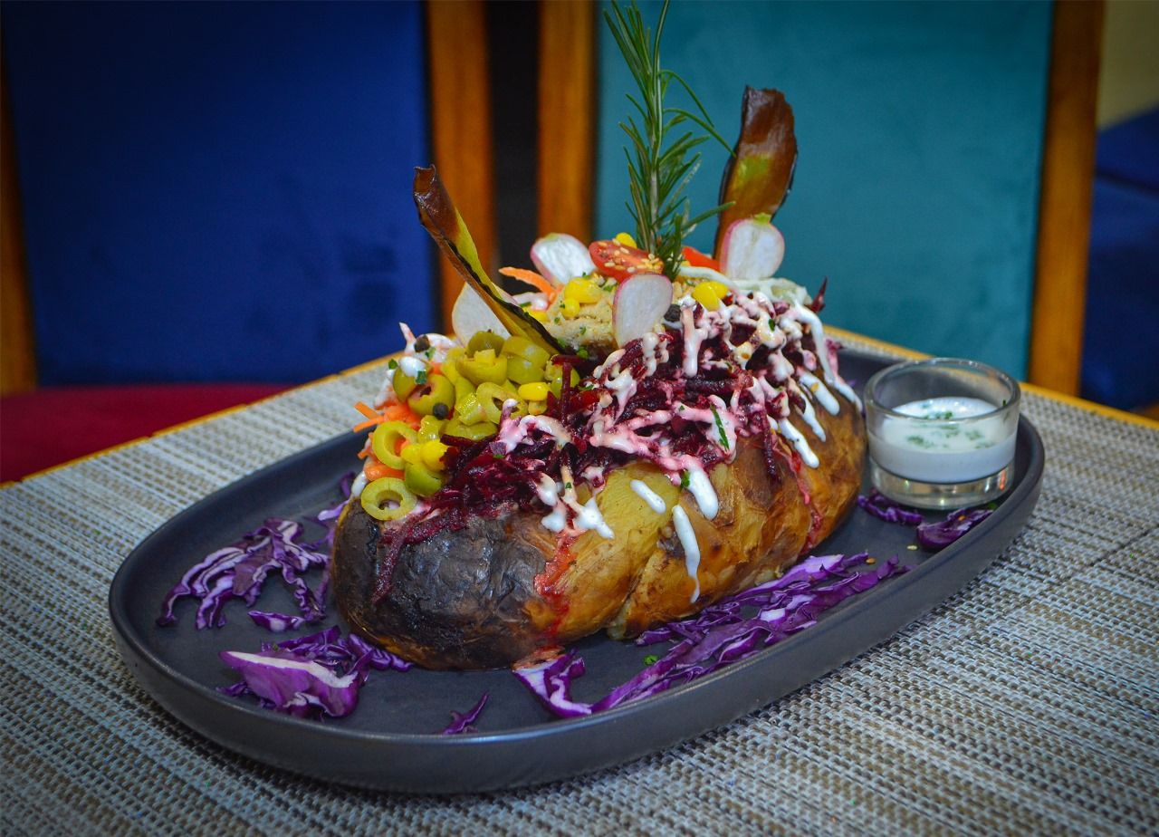Pomme de terre géante, mélange de fromage, thon, carotte, betterave, maïs, olive verte, mélange de fromage, sauce fromage.