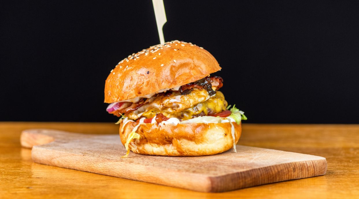 Chopped steak, green salade, tomate, sauce, 2 cheddar, onions