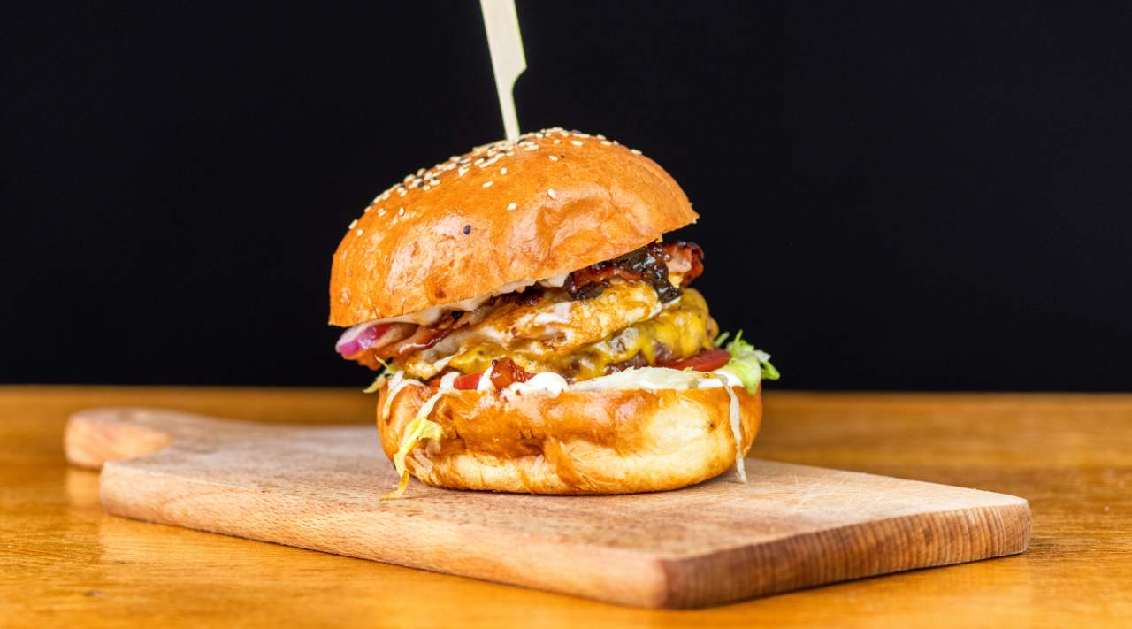 Chopped steak, green salade, tomate, sauce, cheddar, egg