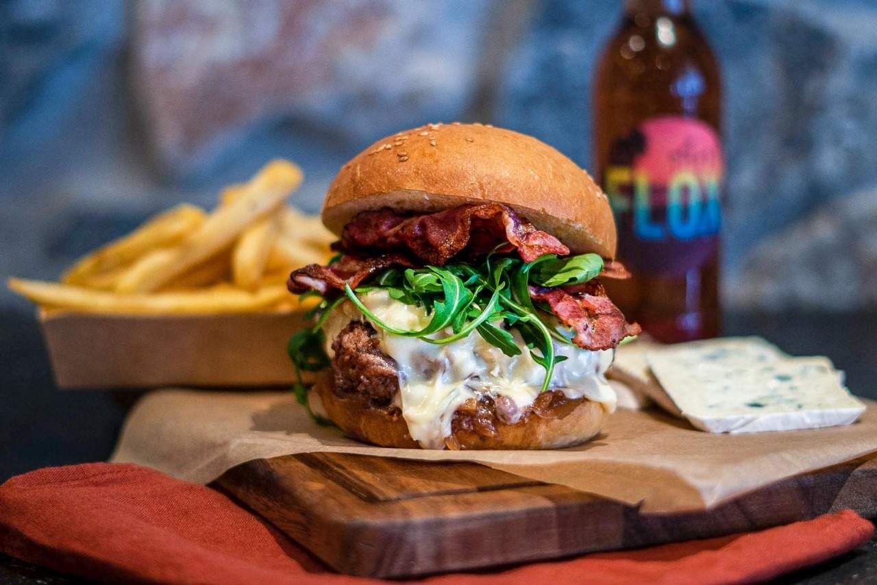 Bun brioché, steak haché de bœuf, Blue Cheese, dinde fumée, oignons confits, laitue, sauce FLOX & frites
