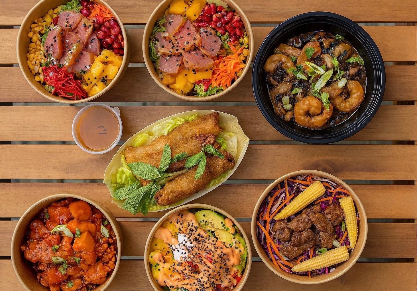 Rouleaux frais aux crevettes, jambon de dinde, carottes, concombre, vermicelle de riz, salade, menthe, accompagnés d'une sauce aigre douce