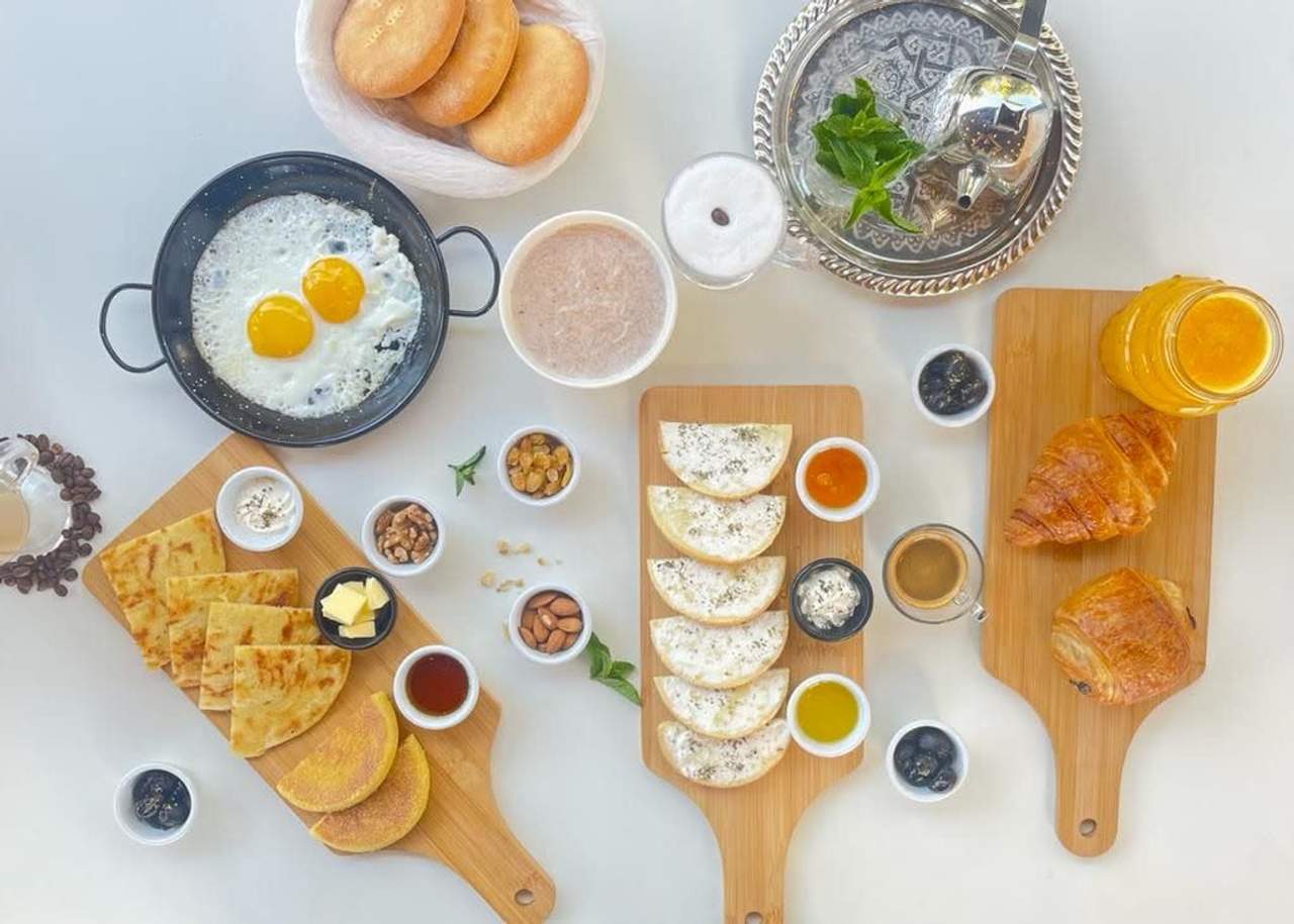 Boisson chaude, Bouteille d'eau ou mini jus de pomme, harcha et meloui, beurre ou jben, miel, huile d’olive, olives ramequins et soupe