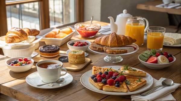 4 Msemen, 4 Baghrir, 4 Harcha, Panier de viennoiseries et Batbout, Mini pancakes au chocolat, Fruits à découper, Miel, Fromage, confiture