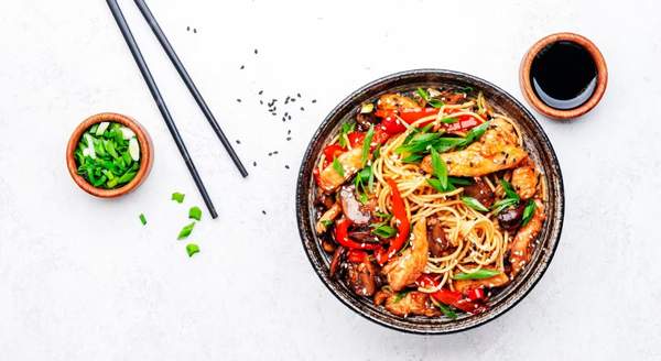 Filet de poulet,Carottes, oignons , choux blanc, brocolis, poivrons ( jaunes , rouges, vert), champignons noirs et champignons de Paris.