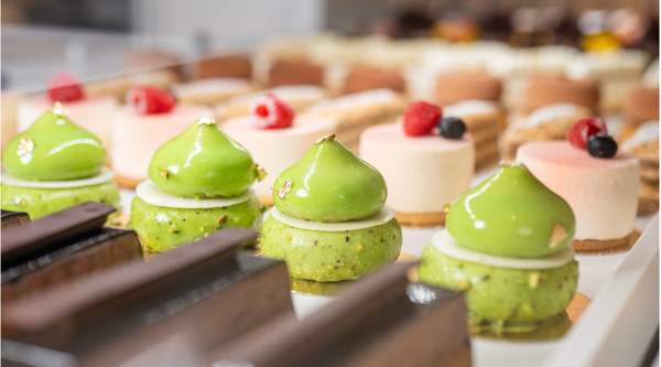 Biscuit moelleux pistache, croustillant pistache-framboise, confit framboise, crémeux calamansi, mousse pistache
