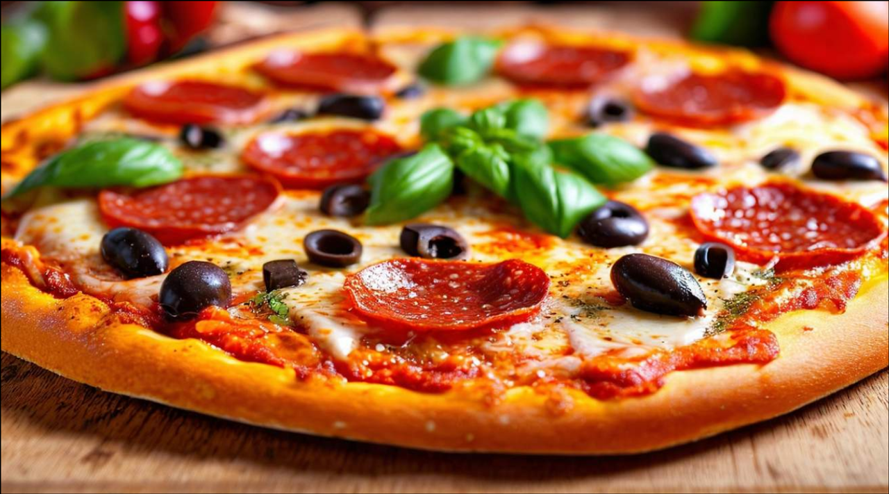 Sauce tomate, mozzarella, pepperoni, olive noir, origon