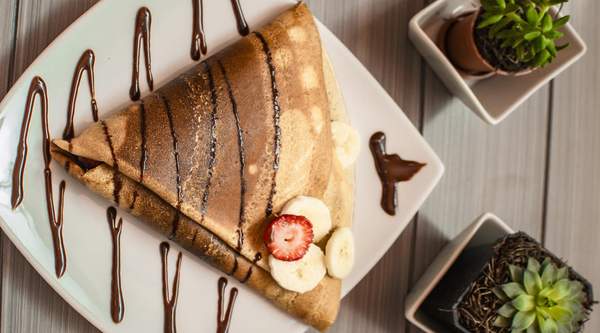 crêpe banane, crème cheese, cannelle, deux chocolats (blanc et au lait)