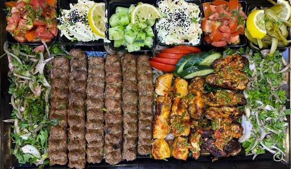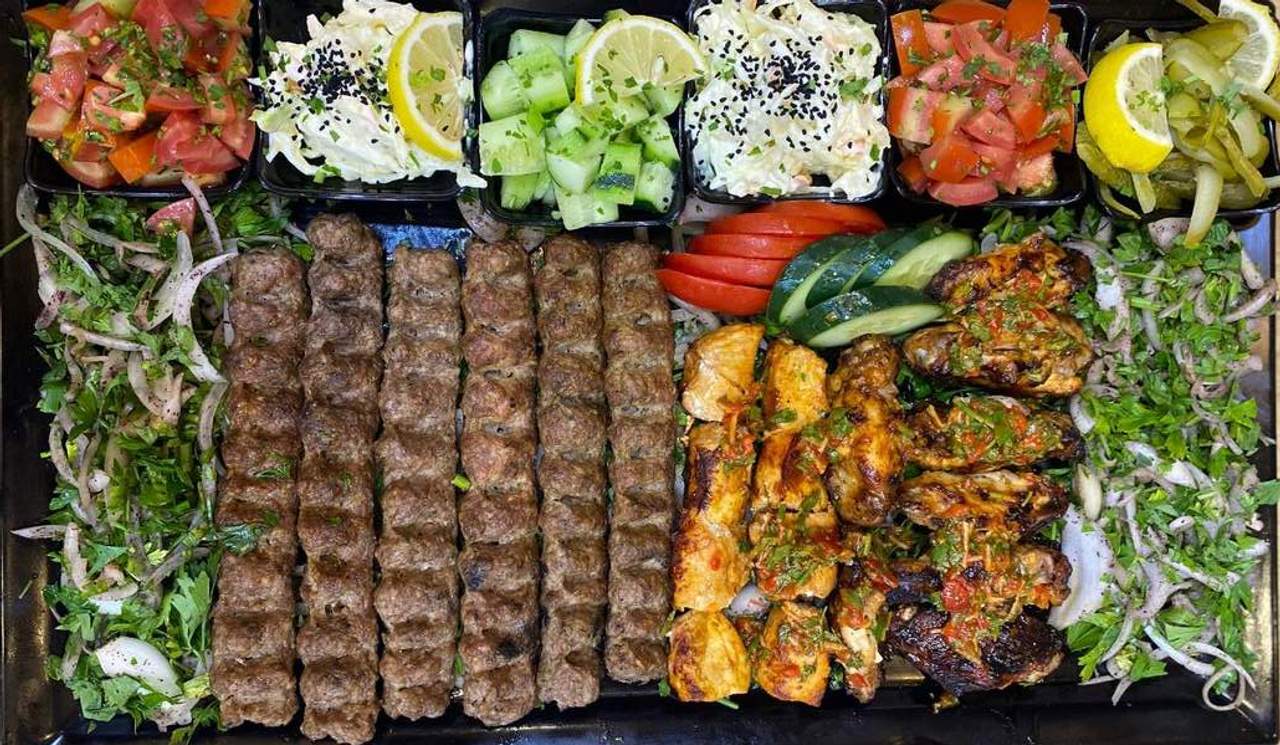 3 Brochettes d'ailes 2 brochettes shish taouk 2 brochettes kebab halabi 2 brochettes kebab aubergines, 2 pieces kebba