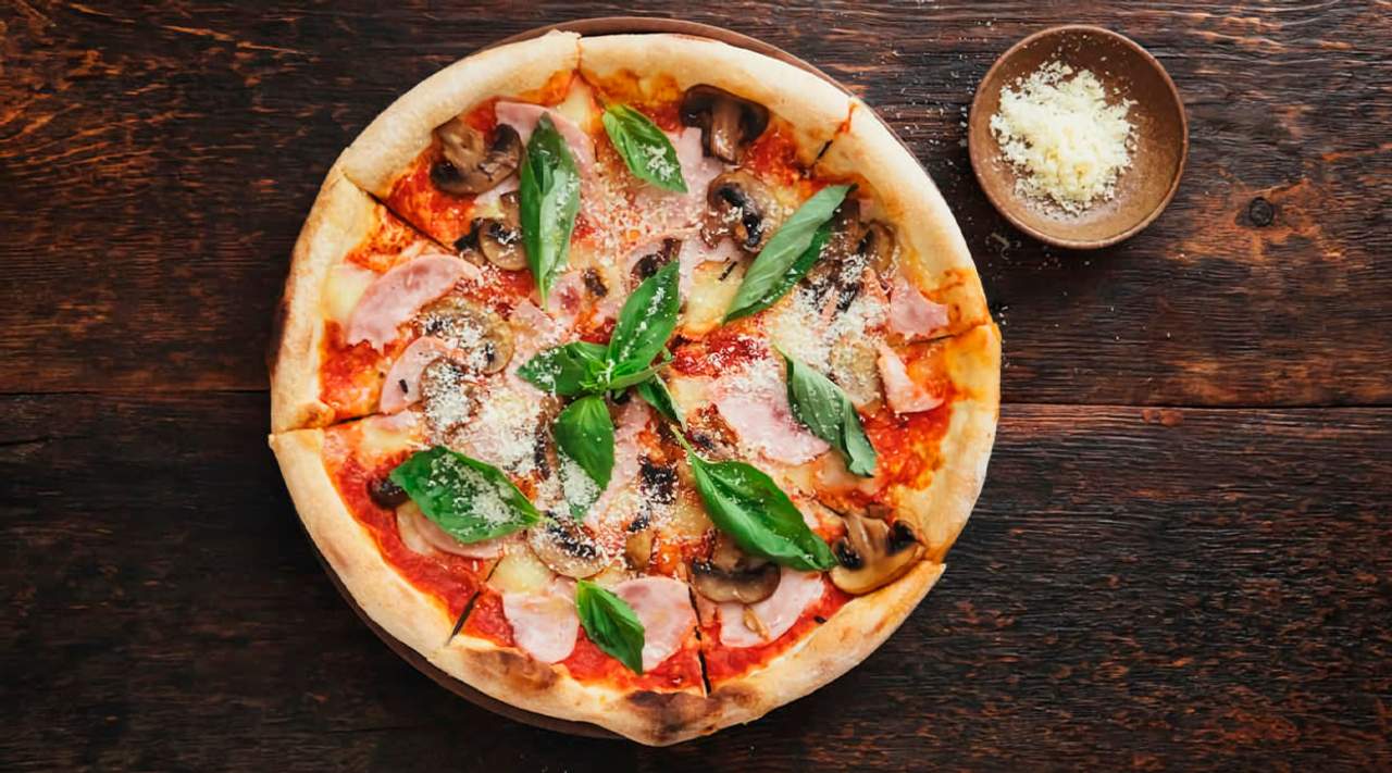 Sauce tomate, champignon, poulet, viande hachée, fruits de mer