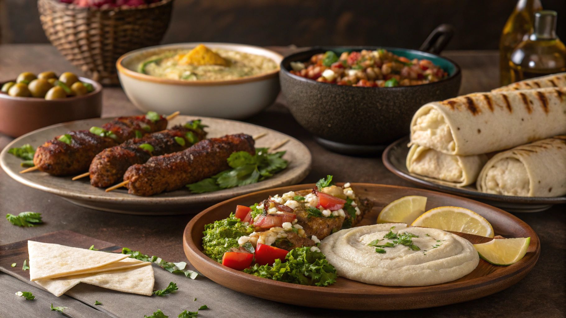 Brochettes de poulet épicées, pain lavash, oignons, persil, tomates grillées, sauce citronnée