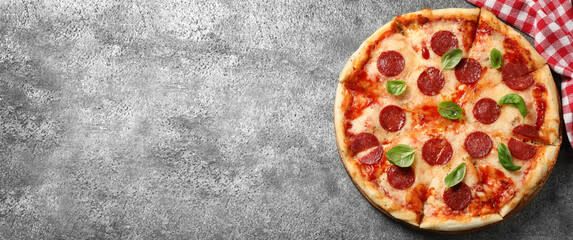 Sauce tomate, mozzarella, mortadelle, champignons, thon, olives noires, poivron