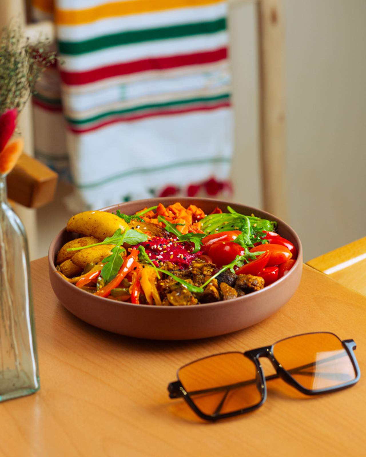 Pommes de terre, poivrons, carottes et aubergines tous grillés au four tomates cerises, avocat, poulet, hummus à la betterave fait maison