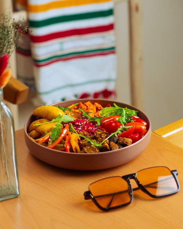 Pommes de terre au four, tomates cerises, concombre, mais, choux rouge, avocat, mangue, saumon fumé