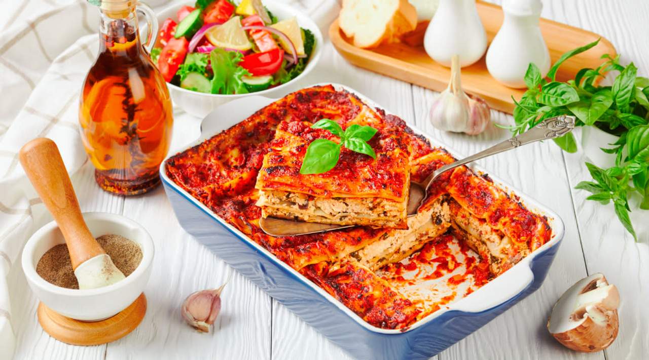 À la tomate, viande hachée maigre, sauce béchamel & fromage, servie avec ses crudités