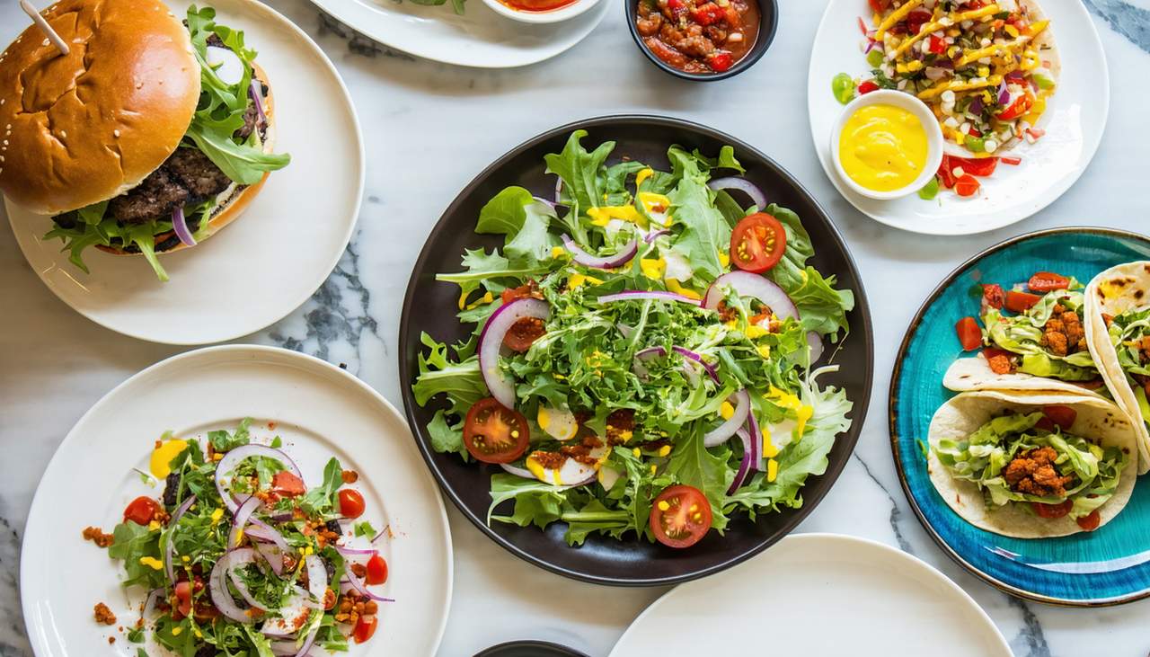 Pain burger, Viande hachée, Salade, Tomate, Oignon, Fromage, Sauce, Cornichons, Mayonnaise, Ketchup, Moutarde, Confits d'oignons, Pommes de terre, Herbes