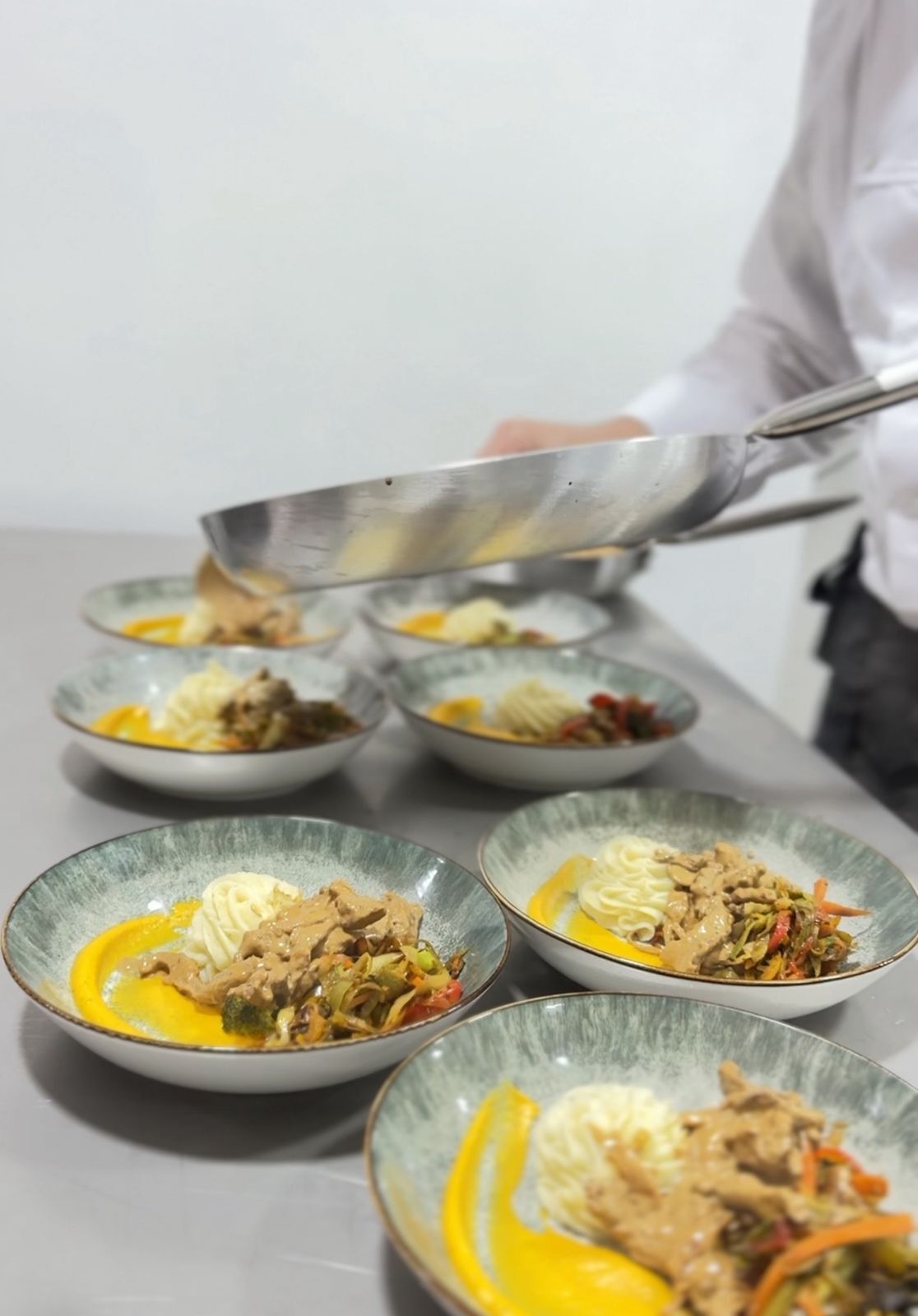 Poulet émincé, sauce crème maison & champignons frais, purée KOZY, légumes wok légèrement caramélisés aux sauces asiatique et finition persillade.