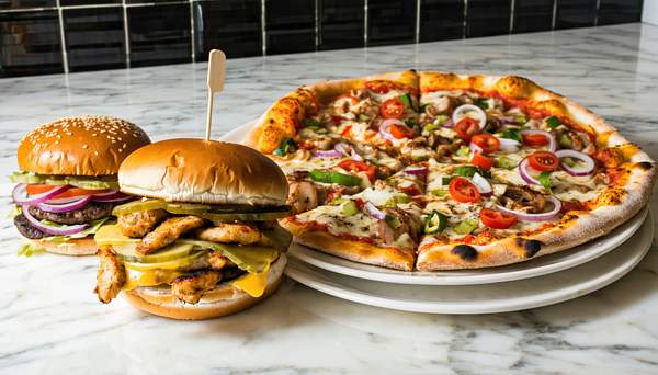 Sauce tomate, mozzarella, viande hachée, poulet, fruit de mer, dinde fumée, poivron mixte