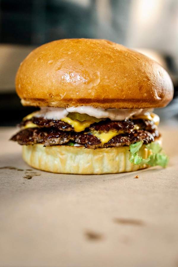 Grilled Flipped Patties with 2 patties of beef, 4 slices of cheese, caramelized onions, house sauce and ketchup