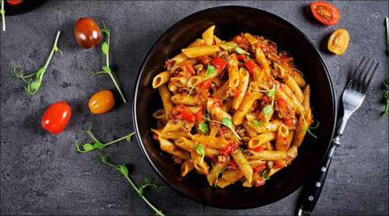 Penne, sauce tomate piquante, burrata, pesto, parmesan