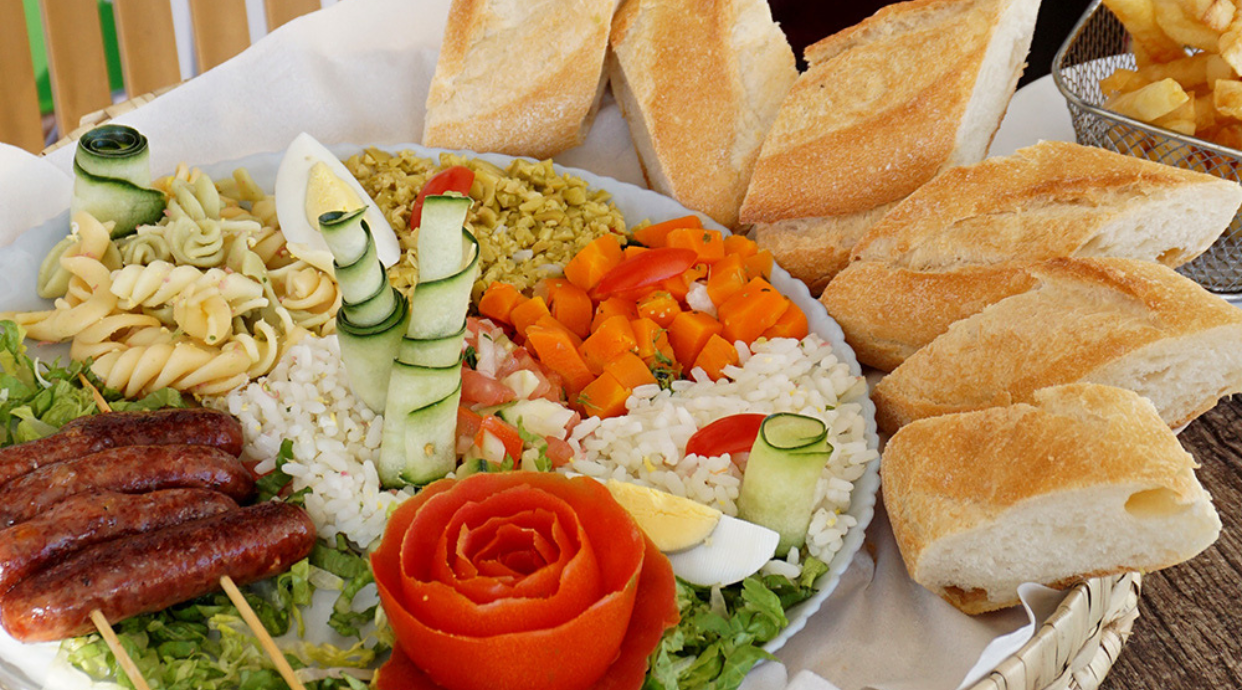 Tomate, oignon, thon, concombre, carottes, pommes de terre, riz, pattes, œuf