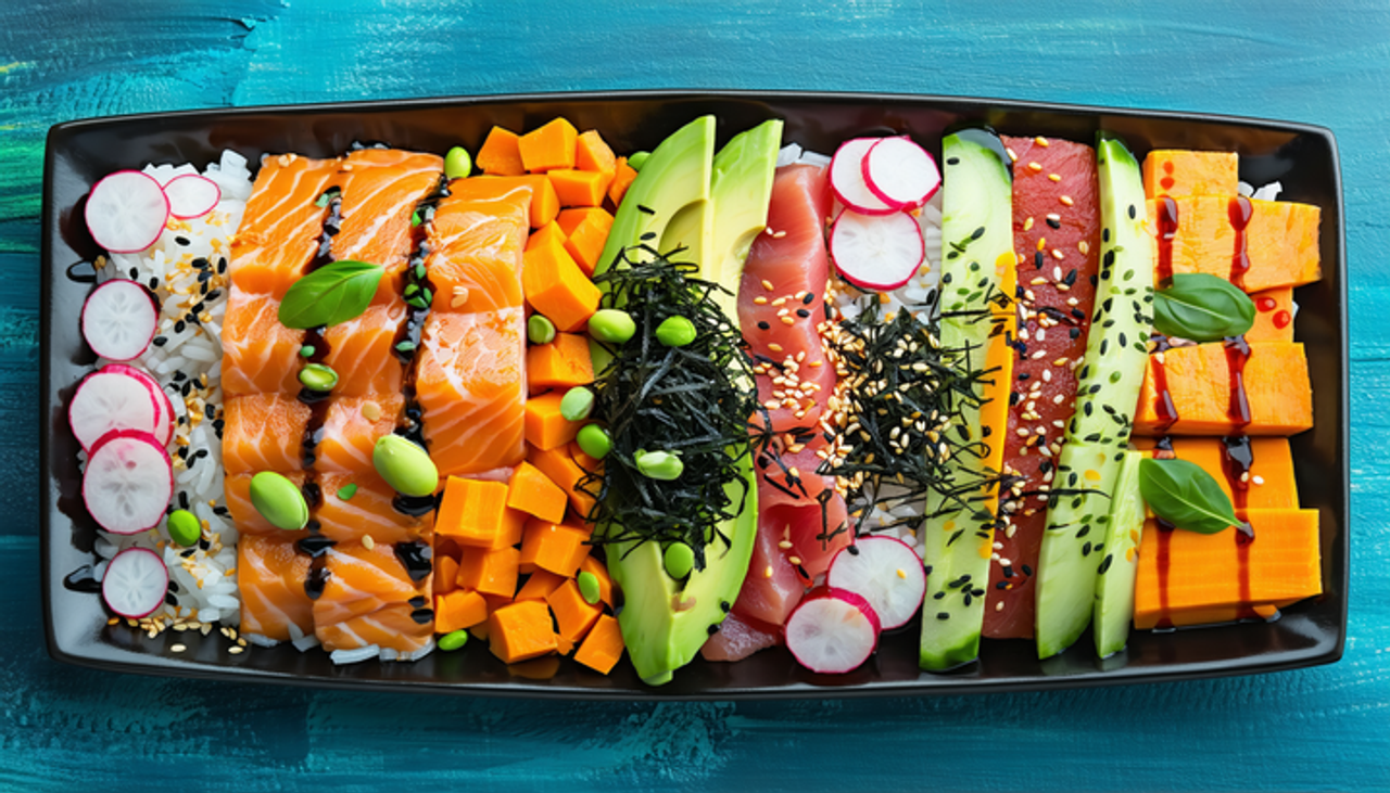 Saumon, riz, avocat, tomate cerise, concombre, carotte, mangue